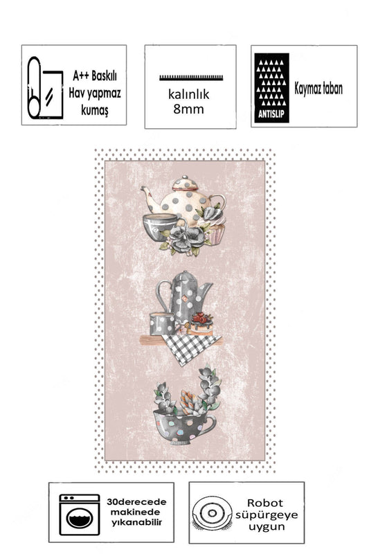 Fincan Pembe Baskılı Kaymaz Taban Mutfak Halısı