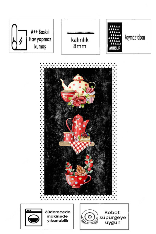 Fincan Siyah Baskılı Kaymaz Taban Mutfak Halısı