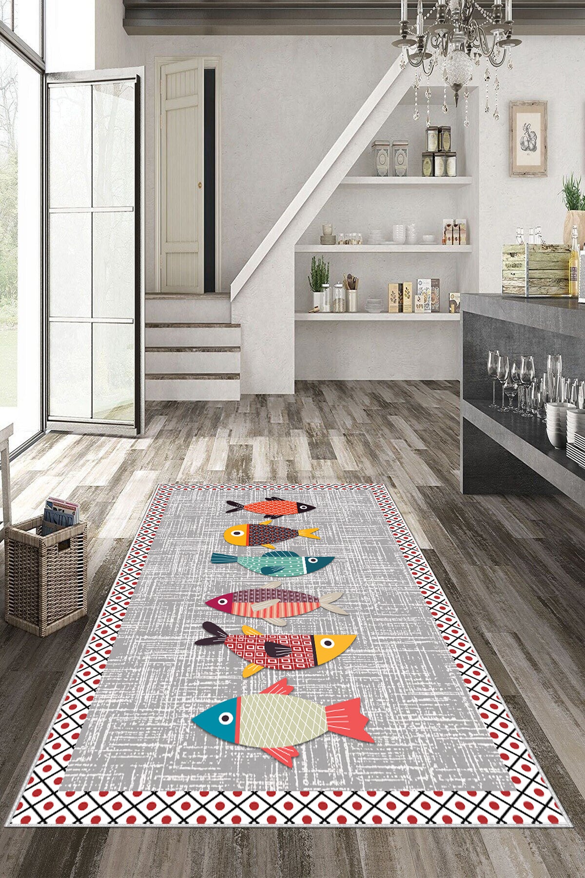 Balık Gri Baskılı Kaymaz Taban Mutfak Halısı