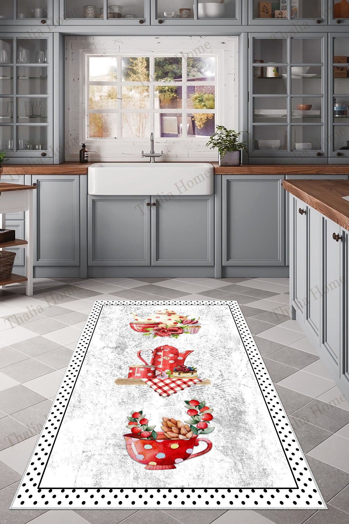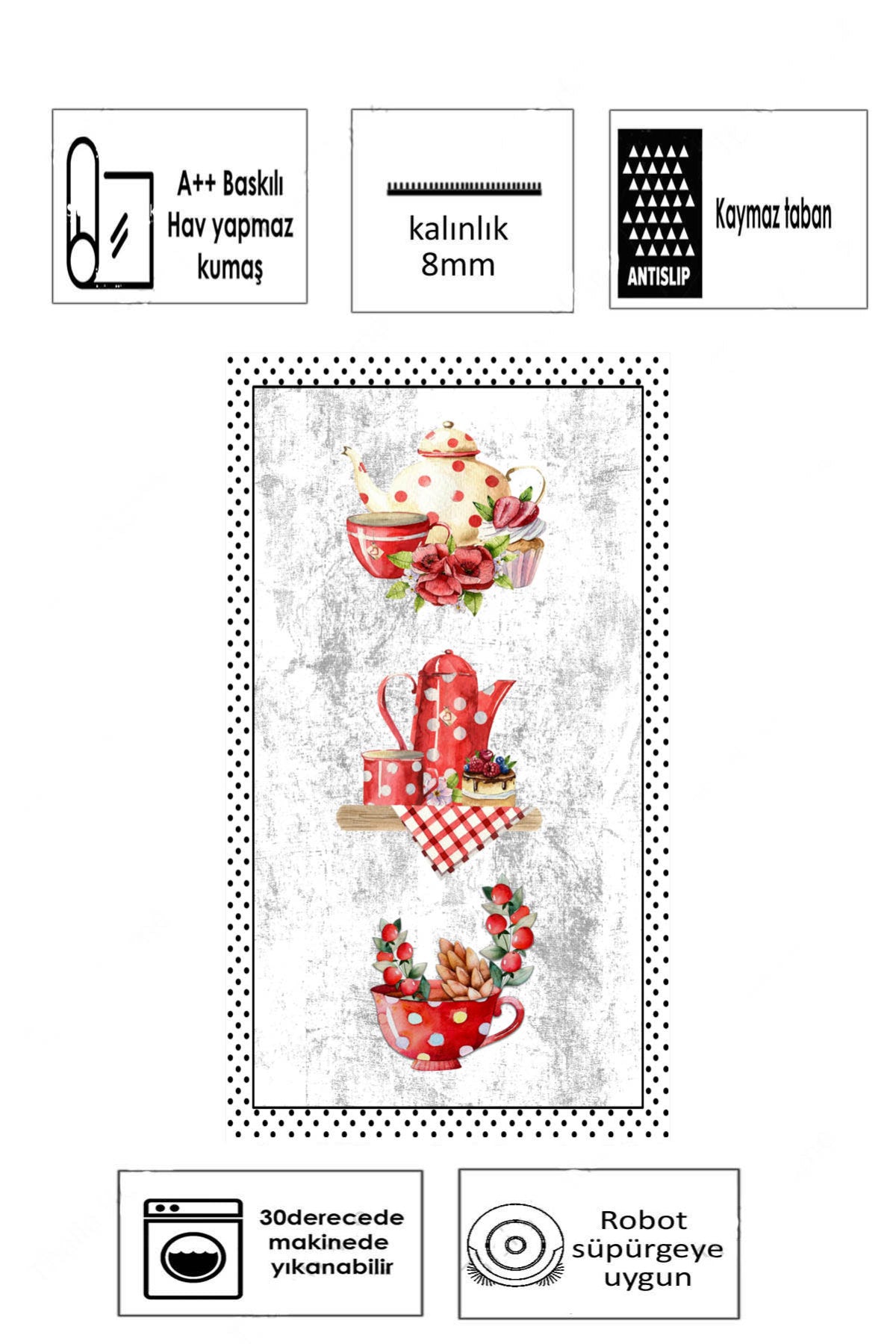 Fincan Beyaz Baskılı Kaymaz Taban Mutfak Halısı