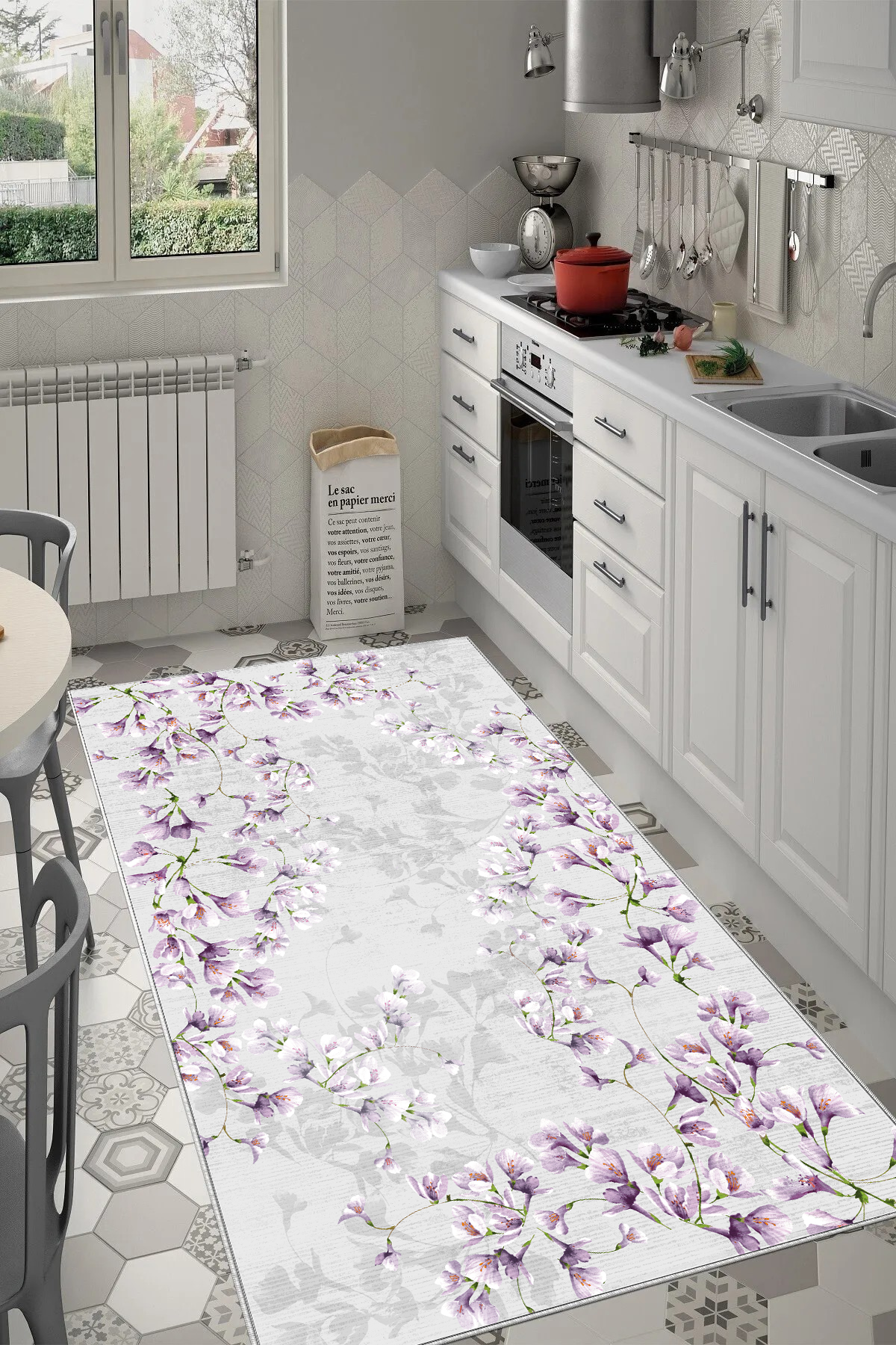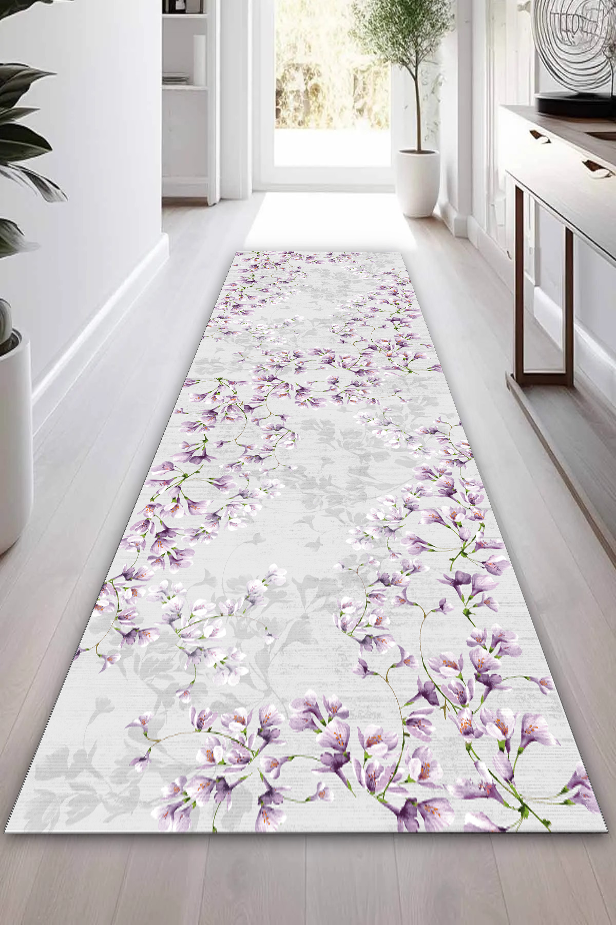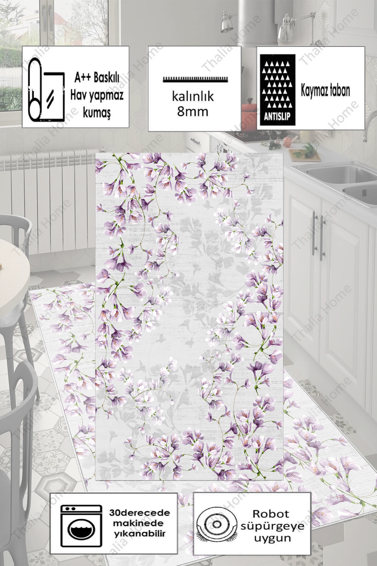 Zarif Lila Baskılı Kaymaz Taban Mutfak Halısı